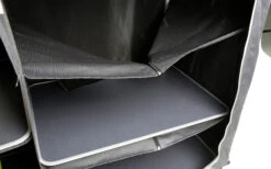 Un cadre prĂ©-assemblĂ© en aluminium, sur lequel est tirĂ©e une housse de haute qualitĂ© en polyester rĂ©sistant, constitue l’ossature des armoires de couleur anthracite. Les canaux de la housse, en polyester indĂ©chirable et rĂ©sistant Ă l’abrasion, dans lesquels une gaze de ventilation est incorporĂ©e Ă l’arrière, assurent un montage et un dĂ©montage rapides, les Ă©tagères Ă©tant simplement insĂ©rĂ©es. Tous les pieds de la platine sont rĂ©glables en hauteur et garantissent un support sĂ»r, mĂŞme sur des surfaces inĂ©gales. L’extrĂ©mitĂ© supĂ©rieure de la construction robuste est formĂ©e par une Ă©tagère. Un sac de transport et de rangement pratique est inclus dans la livraison.