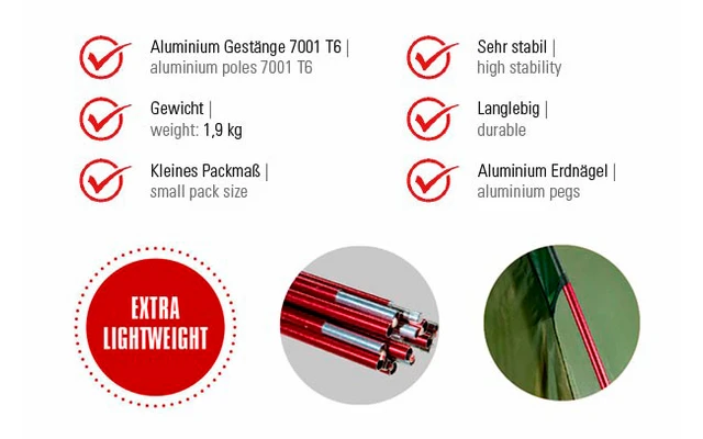 Les piquets de terre en aluminium extra légers et stables ancrent la tente de manière sûre dans le sol. En cas de sol extrêmement dur, il est possible de fixer la tente avec des pierres à l’aide des grandes boucles au sol. La tente extérieure est en polyester de haute qualité avec un revêtement en polyuréthane (PU) de 3000 mm, les coutures sont scellées et la tente est étanche. Grâce à sa construction, la tente à toit simple peut être montée rapidement et sans effort par une seule personne
