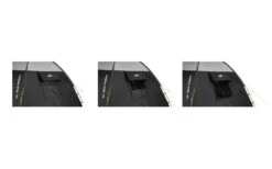 Moustiquaire frontale, deux grandes fenêtres à moustiquaire avec rabats de fermeture éclair aèrent l’espace de vie et tiennent les insectes à l’écart de la tente. 3 ventilations permanentes aèrent la tente même les jours de pluie et doivent toujours être ouvertes. Entrée des câbles à l’extérieur au moyen d’une fermeture éclair et passage des câbles sur l’armature avant pour l’éclairage