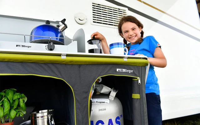 Les compartiments de rangement peuvent ĂȘtre ouverts grĂące Ă la fermeture Ă©clair intĂ©grĂ©e, ce qui permet de ranger des objets plus grands (par exemple la bouteille de gaz). Le meuble de cuisine est dotĂ© d’un plan de travail en aluminium Ă roulettes avec un revĂȘtement en film lavable sous le plan de travail.